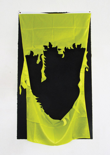 The Flemish flag with its black lion cut out. The black paint on the wall is the negative shape of the complete flag.